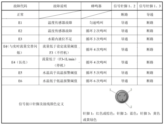 當冷水機系統(tǒng)處于故障或報警狀態(tài)時,會通過多重方式提醒用戶:顯示屏上的故障狀態(tài)標識會點亮,同時流量顯示區(qū)域會清晰顯示故障代碼,蜂鳴器同步鳴笛報警。此外,設(shè)備的報警接口(3芯航空插座)會輸出相應(yīng)的通斷信號,方便用戶快速察覺異常。故障代碼說明如下表所示: