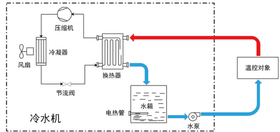 冷水機內部的制冷系統由壓縮機、冷凝器、節流裝置和蒸發器組成,形成一個密閉的“制冷循環”。