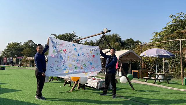 “簽到旗幟贈(zèng)與環(huán)節(jié)” 充滿了儀式感。每位成員在旗幟上鄭重簽下自己的名字、蓋上手印,這不僅是對活動(dòng)的參與,更是對團(tuán)隊(duì)的承諾與擔(dān)當(dāng)。當(dāng)這面承載著眾人期望與信念的旗幟在大家手中依次傳遞,最終由陳總和冉總代表公司鄭重接過,那一刻,責(zé)任與榮譽(yù)的接力棒在團(tuán)隊(duì)中無聲傳遞,將每一位成員的心緊緊凝聚在一起。