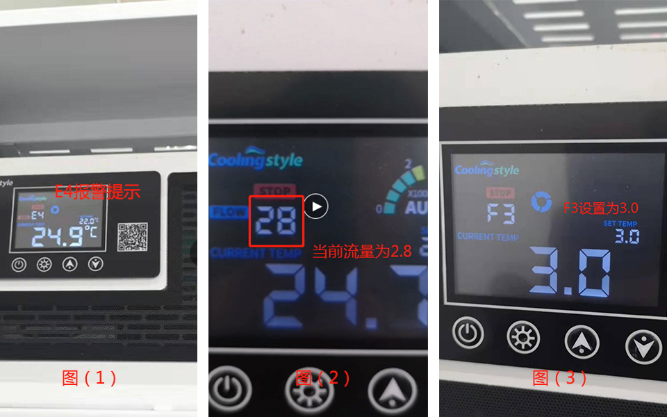 如圖2所示,當(dāng)前流量為2.8,而圖3的F3設(shè)置的流量值為3.0,當(dāng)實時流量小于F3設(shè)置值的時候,所以才出現(xiàn) E4報警,這時您只需要重新設(shè)置F3的最低液位報警值 或者 加液,您的冷水機即可恢復(fù)正常工作啦,如果使用時長很長,您可以順便看看管路是否有雜物,順便清理下管道,這樣您的冷水機制冷效果會更好哦。