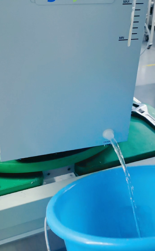 2.先將注水口蓋帽打開,再將排水口塞子打開進行排水,等待排水口無水排出時,稍微將設備向前方傾斜,進一步地將水箱中剩余的水給排出;