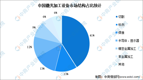 激光加工設備是集合多種先進技術的高科技終端設備,該行業是目前各國最為關注和發展最為迅速的行業之一。在國內激光加工設備市場中,2020年工業激光設備市場規模達432.1億元,占國內激光加工設備市場規模的62.44%;在工業激光設備中,激光切割應用占比最高,占比達41%,激光標刻與激光焊接并列第二位,占比均為13%。
