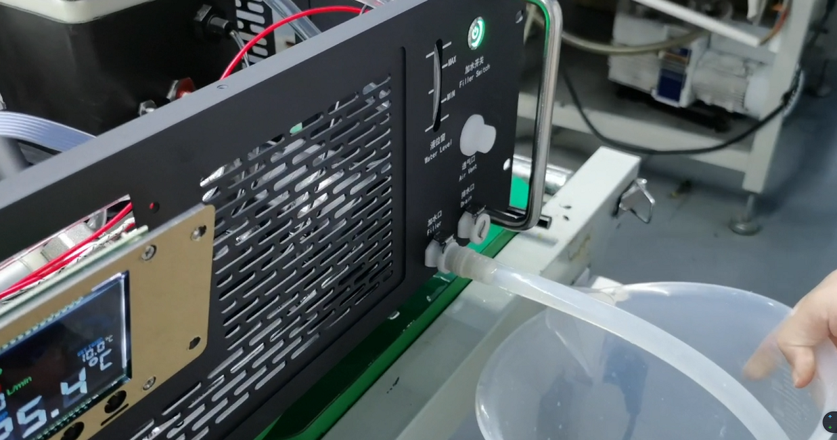2.在加水口接入配套接頭和水管,并將水管深入備好的水(防凍液)中,打開透氣口蓋帽。按下加水開關,內置水泵自動將水吸入機器內,此時可以視液窗看到液位緩慢上升。松開加水開關可停止加液,必須加液至最低液位線以上,為了使冷水機達到更好的效果,推薦加液至最高液位線,最大注水量大約1.8L。若加水過程中發現透氣口有水溢出,說明已完全加滿,應立即停止加水。加水完成,斷開加水管,并蓋上透氣口蓋帽。