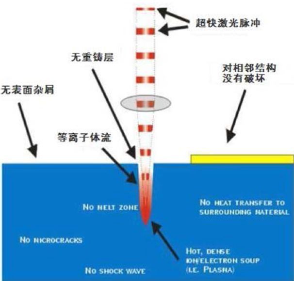 超短脈沖加工能量極快地注入很小的作用區域,瞬間高能量密度沉積使電子吸收和運動方式發生變化,避免了激光線性吸收、能量轉移和擴散等影響,從根本上改變了激光與物質相互作用機制。