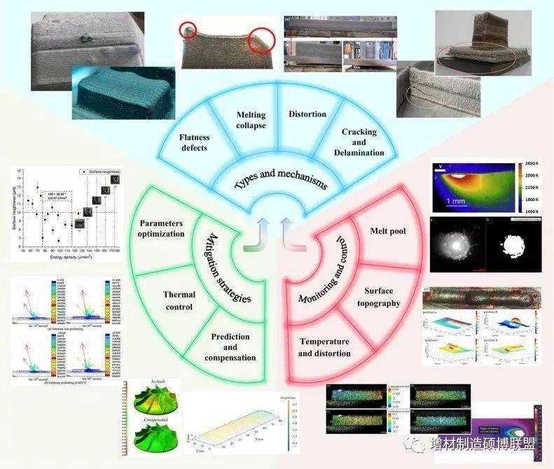 目前,幾何缺陷的形成機(jī)制研究包括熔池失穩(wěn)、復(fù)雜的熱歷史、殘余應(yīng)力、材料/能量波動等,可分為系統(tǒng)性因素和隨機(jī)性因素。幾何缺陷的緩解及補(bǔ)償大多為工藝參數(shù)調(diào)控、預(yù)熱緩冷、基于仿真或形貌監(jiān)測的預(yù)變形及補(bǔ)償,結(jié)合形成機(jī)制—過程監(jiān)測—缺陷調(diào)控的閉環(huán)控制系統(tǒng)仍未形成完整體系。